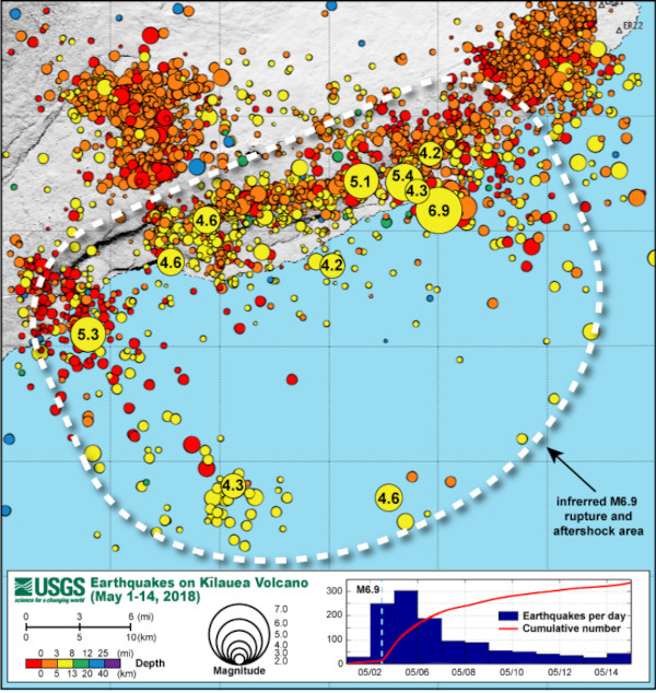 Le séisme de M 6,9 sur le Kilauea le 4 mai 2018 et ses répliques plusieurs mois plus tard (Source: USGS)