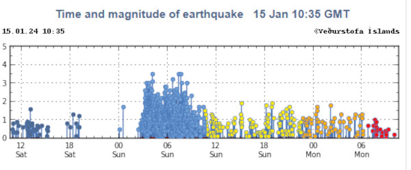 06:00 pm : Obviously, the eruption which began on the morning of January 14th, 2024 is in its final hours. I tried to describe its progress as faithfully as possible by analyzing the excellent images provided by its webcams and the scientific paraameters released online by the Icelandic Met Office.