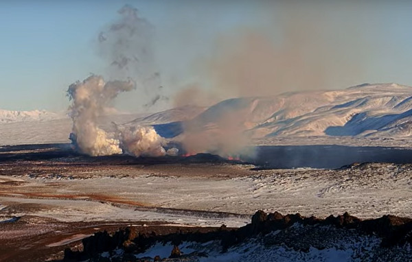 Un panache sombre avec un mélange de cendres et de vapeur s’élevait d’une partie de la fissure éruptive, dû à l’interaction du magma avec les eaux souterraines, ce qui entraînait une petite activité explosive. On a appris un peu plus tard que la lave avait recouvert la canalisation de Njarðvík qui transporte l’eau chaude de Svartsengi vers la péninsule sud. C’est ce qui explique le panache de vapeur dense qui s’élevait de l’endroit où la canalisation a éclaté. Il n’y a désormais plus d’eau chaude dans la partie supérieure de Keflavík, à Sandgerði et à Garður.