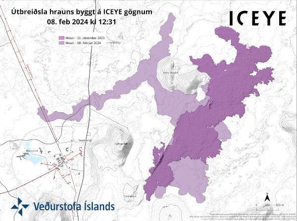 The map below shows outlines of the lava flow as it was seen on a satellite image taken at 12:31 today, February 8th. The satellite image shows that lava flowed about 4.5 km to the west from the eruptive site. For comparison, the lava flow field which formed in the eruption of December 18th, 2023 is also shown on the map. The latest lava flows partly covered the lava flow formed in December 2023.