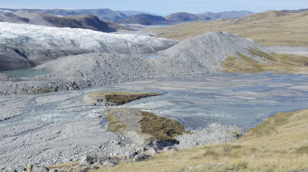 Vue du glacier Russell (ouest du Groenland). Sa fonte a permis à des praires humides et des arbustes de s’installer là où il y avait autrefois de la glace et de la neige (Crédit photo : Université de Leeds)
