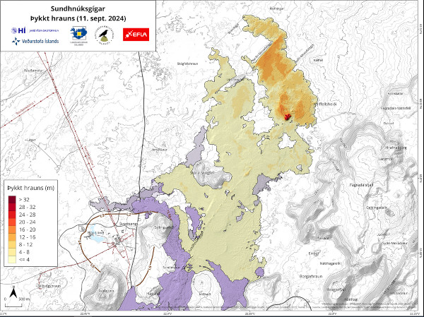 Carte montrant l’étendue et l’épaisseur de la lave sur le site de la dernière éruption. Une carte avec une plus haute résolution est disponible à cette adresse : https://en.vedur.is/media/uncategorized/thykktarkort24092024.png