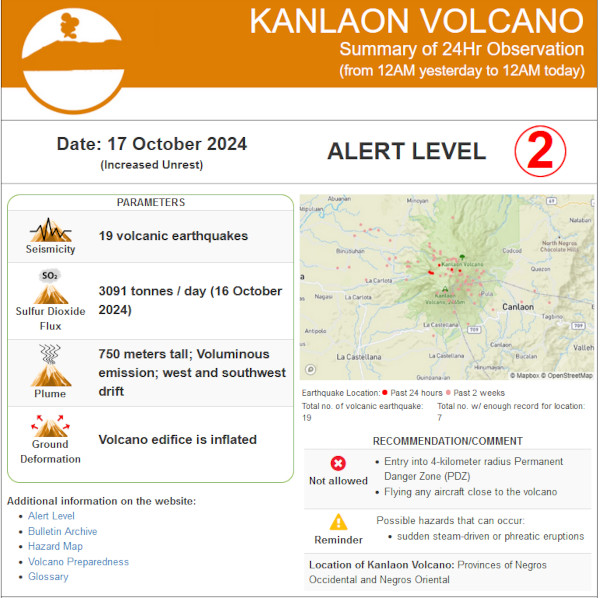 Toujours aux Philippines, l’activité éruptive se poursuit sur le Kanlaon. Elle se caractérise par une sismicité élevée et des émissions de dioxyde de soufre. Les émissions de gaz et de vapeur s’élèvent de 400 à 750 m au-dessus du sommet. Les émissions de SO2 sont en moyenne de 1 919 à 6 011 tonnes/jour. Le niveau d’alerte reste à 2 (sur une échelle de 0 à 5) et le PHIVOLCS rappelle au public de rester en dehors de la zone de danger permanent d’un rayon de 4 km.