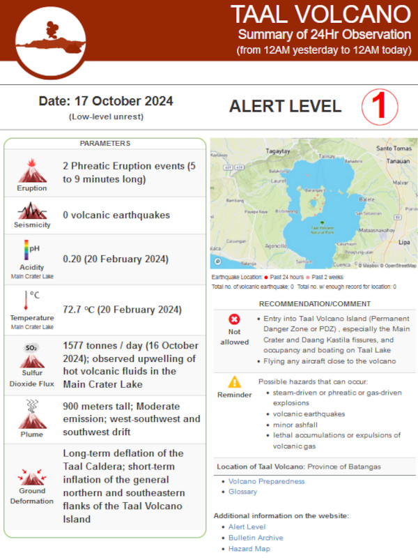 Phreatic eruptive events periodically continue at Taal (Philippines). The upwelling of hot fluids in the lake is permanently observed, and daily steam-and-gas emissions rise as high as 3 km above the crater rim. Seismicity is still significant. SO2 emissions remain at elevated levels. The Alert Level remains at 1 (on a scale of 0-5), and PHIVOLCS reminds the public that the entire Taal Volcano Island is a Permanent Danger Zone (PDZ) that should remain prohibited.