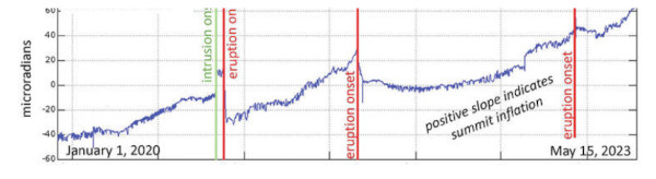 Données d’inflation du Kilauea obtenues grâce aux inclinomètres installés dans la zone sommitale du volcan (Source : HVO).