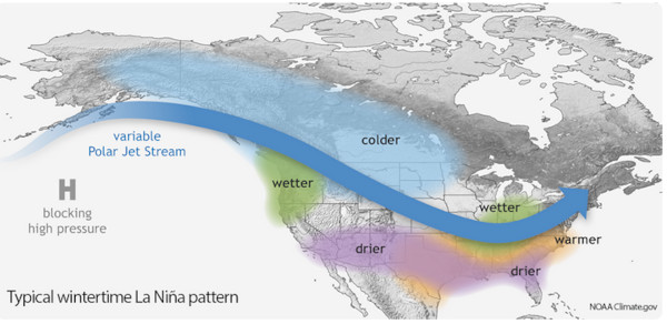 In North America, La Niña often brings colder, snowier winters to Canada and the northern United States, while the southern states experience warmer, drier conditions.