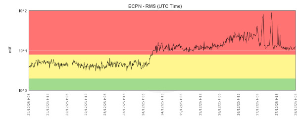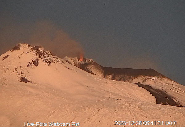 Dans son dernier bulletin diffusé vers 20h45 (heure locale) le 27 décembre 2025, l’INGV indique que ce même jour à 18h48, une série de fortes explosions a débuté au cratère Nord-Est de l’Etna, avec projection de matériaux pyroclastiques sur l’ensemble du cône et bien au-delà de sa base. Des explosions stromboliennes sporadiques se produisaient au moment de la publication du bulletin.