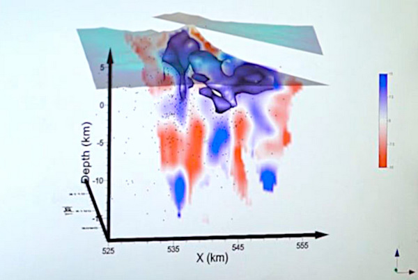 L’étude montre la présence d’un système magmatique en forme de champignon dans deux régions présentant une vitesse des ondes S (Vs) élevée. Ces régions sont situées respectivement entre 0 et 5 kilomètres d’altitude, et entre 4 et 7 kilomètres de profondeur, et sont reliées par un conduit étroit en forme de tube.