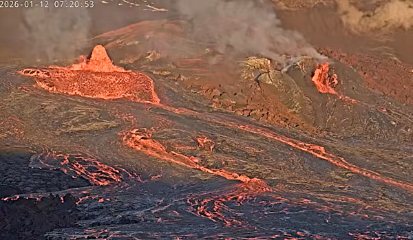 Lava fountaining began at 8:22 a.m. (local time) on January 12, 2026 at the north vent. Their height increased progressively and reached about 200 meters. Sustained lava fountains are not erupting from the south vent but intermittent lava spattering and small dome fountains continue.