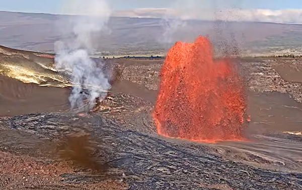 Les fontaines de lave de l’épisode 40 du Kilauea ont mis un certain temps à apparaître. À partir du 10 janvier, elles ont été précédées de nombreuses et spectaculaires débordements, principalement de la bouche sud, bien que la bouche nord ait également été active ces dernières heures. L’une des coulées issues de ces débordements a couvert une distance de 1 km dans le cratère de l’Halema’uma’u.
