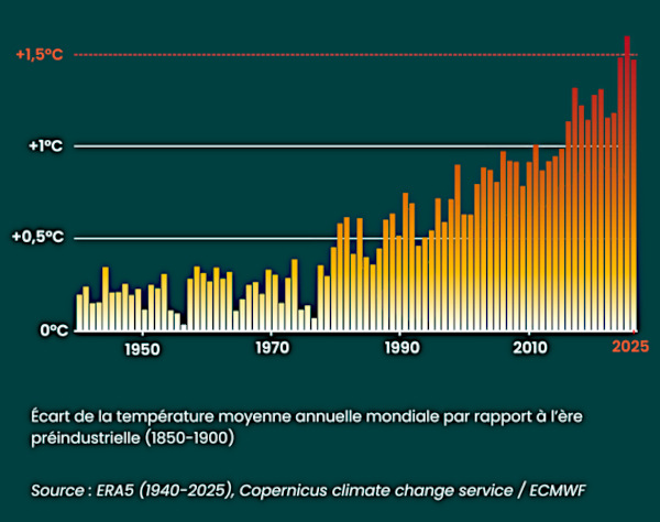 Avec une température moyenne mondiale de 14,97°C – 1,47°C au-dessus des niveaux préindustriels (1850-1900) – 2025 talonne 2023 (-0,01 °C) et 2024 (-0,13°C), fournissant »une preuve supplémentaire de la tendance indéniable vers un climat plus chaud. » En première position, l’année 2024 affichait 1,60°C de réchauffement par rapport au 19ème siècle.