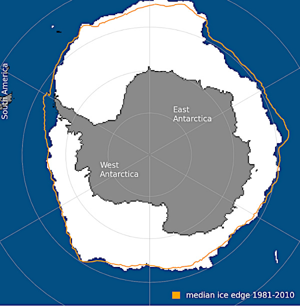 Étendue de la banquise antarctique le 17 septembre. La limite moyenne de la banquise pour la période 1981-2010 est représentée en jaune. (Source : NSIDC)