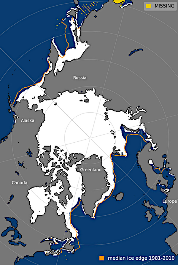 Le 22 mars, la banquise arctique a atteint son étendue maximale avec 14,33 millions de kilomètres carrés. Cette étendue maximale est inférieure de 1,31 million de kilomètres carrés à la moyenne maximale de 15,64 millions de kilomètres carrés observée entre 1981 et 2010, et inférieure de 80 000 kilomètres carrés au précédent maximum le plus faible, enregistré le 7 mars 2017.