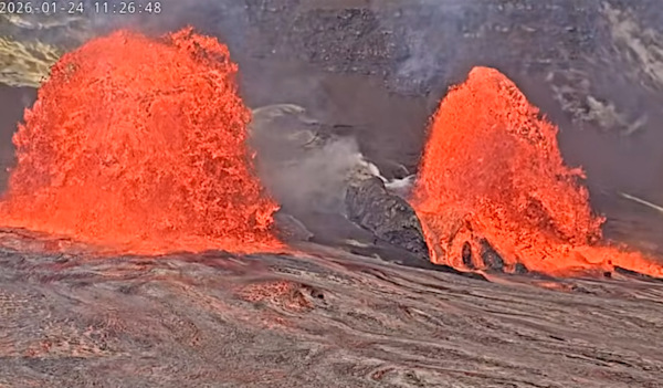 L’Épisode 41 du Kilauea, avec ses fontaines de lave, a débuté à 11h10 (heure locale) le 24 janvier 2026.dans le cratère de l’Halemaʻumaʻu. Comme lors des épisodes précédents, l’événement a commencé par des débordements de lave au niveau des bouches éruptives nord et sud, où l’on pouvait également observer des fontaines en dôme. Cette activité a évolué en fontaines de lave dont la hauteur a progressivement augmenté. Elles montent très haut, au moins à 300 mètresDu grand spectacle !