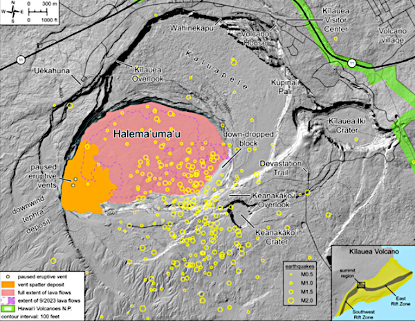 – Poursuite de l’éruption. La lave pourrait continuer à jaillir des bouches éruptives nord et sud dans l’ l’Halemaʻumaʻu pendant une durée et un nombre d’épisodes imprévisibles.
