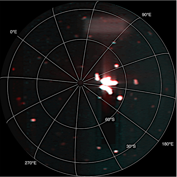 Données brutes communiquées par JIRAM et recueillies le 27 décembre 2024 à une distance d’environ 100 000 km. La sonde observait le pôle Sud d’Io ; le pic d’activité est clairement visible à droite du pôle.