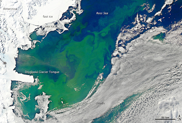 Efflorescence phytoplanctonique en Antarctique (Source : NASA)