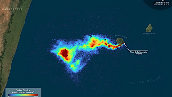 Le panache de SO2 observé le 14 février 2026 par le satellite Sentinel-5 Precursor du programme européen Copernicus.