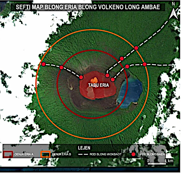 On February 25, the Vanuatu Meteorology and Geo-Hazards Department (VMGD) raised the Alert Level to Level 3, indicating a minor eruption state. The hazard area was expanded to 3 km around the active vent within Lake Voui (see image above).
