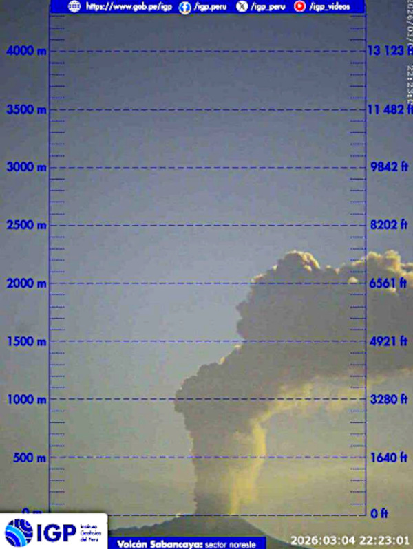 The IGP has sent me a message indicating that an explosion with an ash plume was observed on March 4, 2026, at Sabancaya (Peru). The plume rose to a height of over 2,000 meters before drifting over approximately ten kilometers. (see image above)