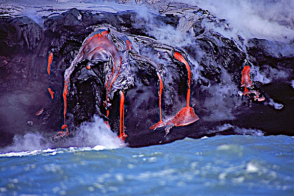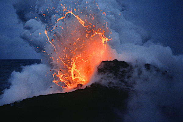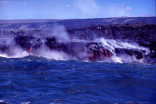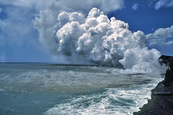 J’ai personnellement eu l’occasion – la chance , devrais-je dire – d’assister au mariage de la lave et de l’océan à Hawaï, depuis la terre, mais aussi depuis la mer. Je confirme les recommandations de prudence décrites plus haut. Il faut en particulier de méfier des sautes de vent qui peuvent transporter les gaz toxiques là où on ne les attend pas. Je suppose que le site où la lave entrera dans la mer sera interdit d’accès. Si des personnes parvenaient toutefois à l’atteindre, je leur recommande d’emporter un bon masque anti-gaz, au cas où.