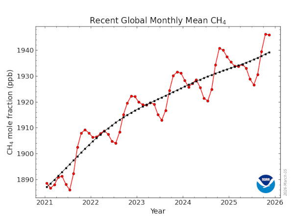 Les données relatives aux concentrations de CH4 sont mises à jour trimestriellement ou annuellement. Les dernières données disponibles remontent à novembre 2025 date à laquelle la concentration de méthane atteignait 1945,85 ppb (parties par milliard), contre 1 941 ppb en septembre de cette même année. La concentration de méthane dans l’atmosphère a plus que doublé au cours des 200 dernières années. Les scientifiques estiment que cette augmentation est responsable de 20 à 30 % du réchauffement climatique observé depuis la révolution industrielle (qui a débuté en 1750). C’est pourquoi la concentration de méthane accompagnera la concentration de CO2 au début de mes notes sur le réchauffement climatique.