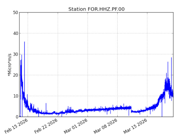 Les débits de lave sont en hausse. Ils atteignaient des pics de plus de 30m3/seconde le 21 mars. Deux bras de coulée principaux sont toujours présents, mais le plus au nord est toujours figé dans le bas des Grandes Pentes.