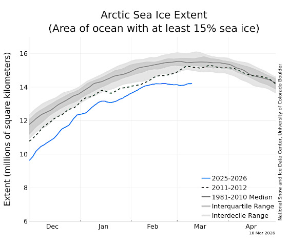 Une grande partie de l’Ouest américain vient de connaître l’hiver le plus chaud jamais enregistré. Il a déjà réduit le manteau neigeux à son plus bas niveau depuis au moins vingt ans, des Rocheuses du Colorado aux Cascades de l’Oregon. Le National Water and Climate Center.fait remarquer qu’au Colorado, le manteau neigeux est à son plus bas niveau pour un mois de mars depuis 40 ans.