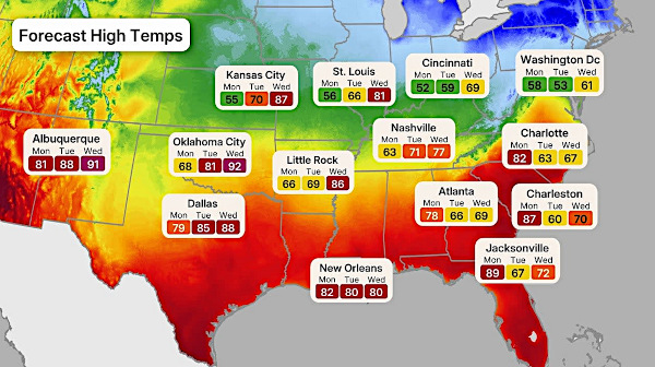 À ce jour, au moins 125 villes des États Unis ont déjà égalé ou battu des records de chaleur pour un mois de mars. Par exemple, Phoenix a établi un record absolu de température le 19 mars avec 40,5 °C, et l’a battu à nouveau le 20 mars. Las Vegas a battu son record de chaleur avec 36 °C. La Vallée de la Mort a également battu son record pour un mois de mars avec 40,5 °C. Les précédents records remontaient au 26 mars 2022 et au 19 mars 2026. L’aéroport de San Francisco a également battu son record pour un mois de mars avec une température de 31,6 °C, dépassant ainsi le précédent record de 29,4 °C établi en mars 1953.