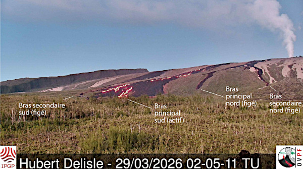 The eruption of Piton de la Fournaise resumed on March 28th around 3:00 PM (local time). According to the OVPF, since the activity resumed at the same eruptive site, without the opening of a new fissure or the injection of a new dyke, this is a resumption of the eruption that began on February 13, 2026, and not a new eruption. I had explained that it was probably the emptying of a residual magma chamber. It should be noted that slight inflation of the volcano has been recorded over the last three days, indicating the repressurization of the shallow magma reservoir. This inflation is accompanied by a slight increase in seismicity. The intensity of the eruptive tremor gradually increased at the end of March 28th, before stabilizing and then increasing slightly again at the beginning of March 29th.
