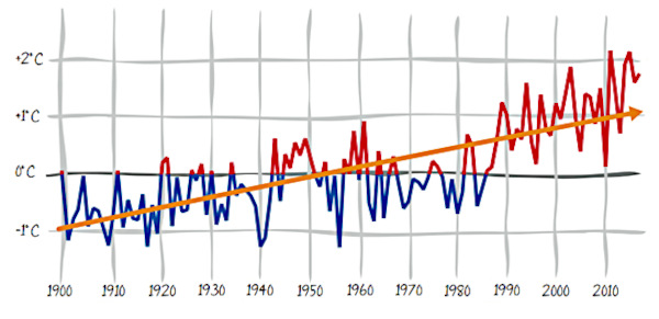 Évolution de la température moyenne annuelle dans les Alpes françaises (Source : Données HISTALP/Météo France)