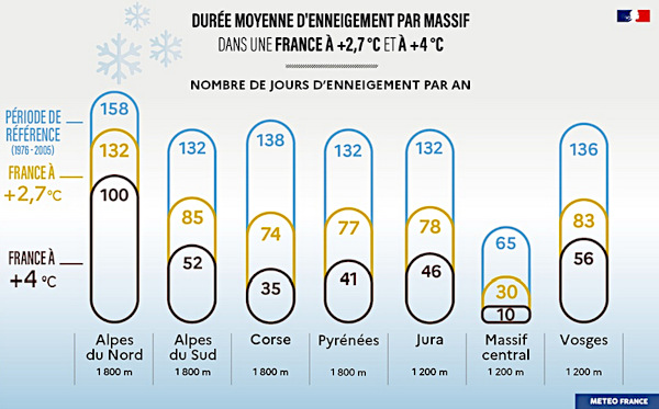 Selon les prévisions de Météo France, à 1 200 mètres d’altitude, au train où vont les choses, les températures augmenteraient de +3,4°C en hiver et de +4,7°C en été, contre +3°C et +4°C en moyenne nationale. Cela représente un réchauffement de 10 à 20 % supérieur à la moyenne française.