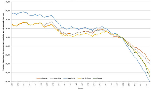 Variation d’épaisseur (en mètres) des glaciers en France (Source : Association Moraine et IGE)