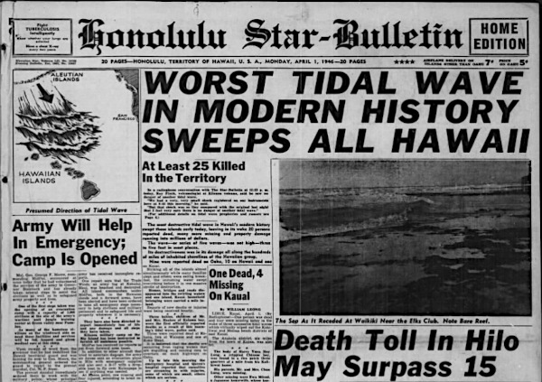 Plus récemment, le 1er avril 1946, un tsunami provoqué par un important séisme dans les îles Aléoutiennes a causé de graves dégâts à Hawaï.