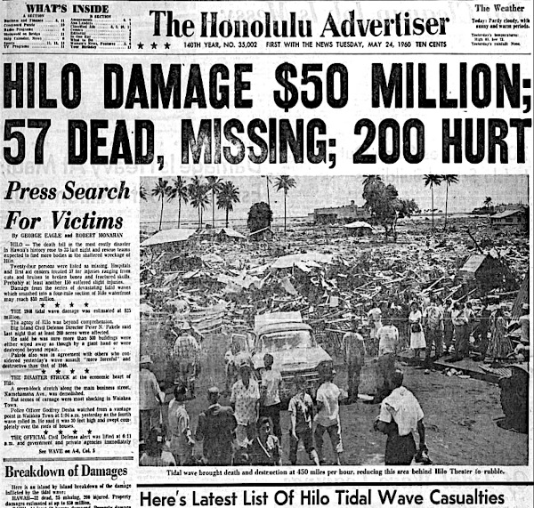 Un autre tsunami dévastateur a frappé l’archipel hawaïen le 23 mai 1960. Il a été provoqué par le séisme de Valdivia, de magnitude M9,5, survenu le long des côtes chiliennes. Il s’agit de la plus forte magnitude jamais enregistrée. Ce tsunami a causé peu de dégâts ailleurs dans l’archipel, mais la baie de Hilo a été durement touchée. 61 personnes ont perdu la vie et environ 540 maisons et commerces ont été détruits ou gravement endommagés. Dans la baie d’Hilo, la hauteur des vagues a atteint 10 mètres, contre seulement 1 à 5 mètres ailleurs.