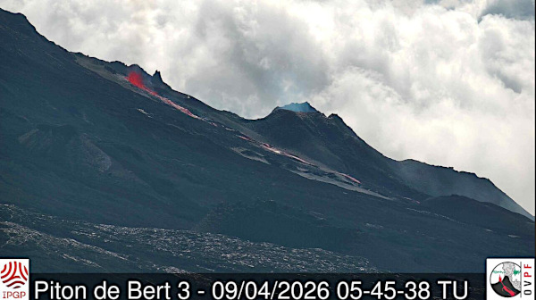 9 avril 2026 – 8 heures (heure métropole) : Le Piton de la Fournaise n’arrête pas de nous surprendre . Comme on dit localement, « volcan i fé la malis ». Suite à la reprise de l’éruption le 8 avril avec un petit lac de lave dans les cône éruptif et des résurgences de lave en aval, on observe ce 9 avril une sortie de lave à côté du cône éruptif ! J’attends avec impatience la confirmation de l’OVPF ainsi que les dernières informations concernant le témor éruptif, la sismicité et l’inflation du volcan.