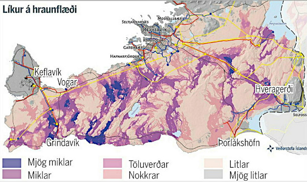 Selon ce rapport, le risque lié à la lave sur la péninsule de Reykjanes est maximal dans les zones où existe la probabilité la plus élevée de fissures éruptives, de coulées de lave, ou des deux.