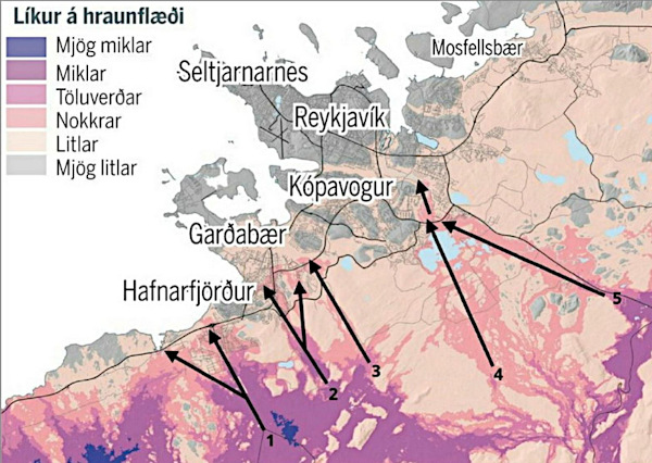 Au sud-est de Hafnarfjörður, certaines zones présentent une probabilité d’éruptions considérée comme modérée à élevée en raison de leur proximité avec le système de Krýsuvík. Il existe également une petite zone dans le secteur de Garðabær où la probabilité est modérée.