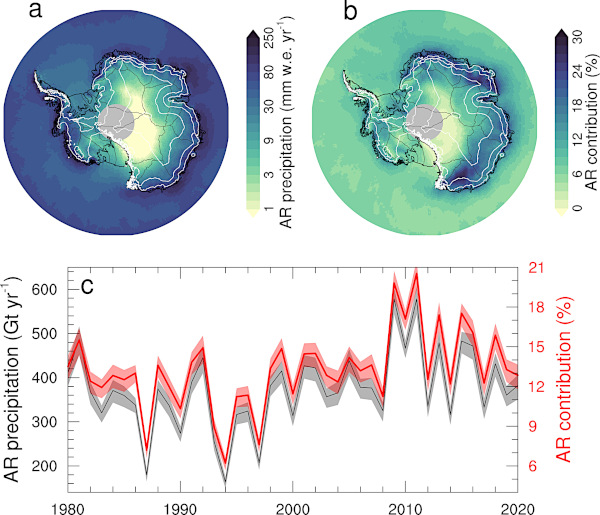 (a) Précipitations moyennes attribuées aux rivières atmosphériques (RA) de 1980 à 2020 ; (b) Contribution moyenne des précipitations des RA aux précipitations annuelles totales de 1980 à 2020 ; (c) Série chronologique (1980-2020) des précipitations des RA sur la calotte glaciaire antarctique(Source: AGU)