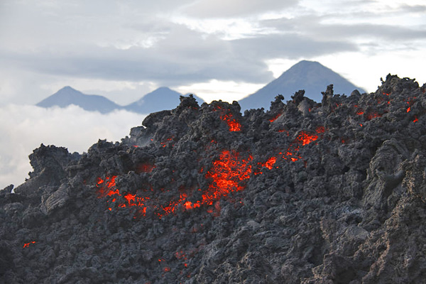 L’activité effusive sur le flanc ouest se poursuit avec la réactivation du front de coulée de lave à La Breña. La coulée s’est à nouveau déplacé vers l’ouest, tandis que le front au niveau de la ferme de Campo Alegre s’est arrêté. La longueur totale de la coulée dépasse 3000 mètres. La coulée de lave présente plusieurs branches qui provoquent des incendies dans la végétation et les cultures qu’elle rencontre, ainsi que la destruction de bâtiments et l’interruption des routes. La lave s’approche dangereusement des villages d’El Patrocinio, San Vicente Pacaya. Il est prévu d’essayer de canaliser la lave si la menace se précisait.