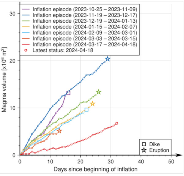 On enregistre toujours un soulèvement du sol dans la région de Svartsengi, ce qui indique une accumulation continue de magma en profondeur. Les modèles estiment qu’entre 7 et 8 millions de mètres cubes de magma ont alimenté le réservoir sous Svartsengi depuis le début de l’éruption actuelle. Le Met Office estime que, lorsqu’un seuil d’environ 8 à 13 millions de mètres cubes sera atteint, le magma pourrait se déplacer vers la surface sous forme d’intrusions.