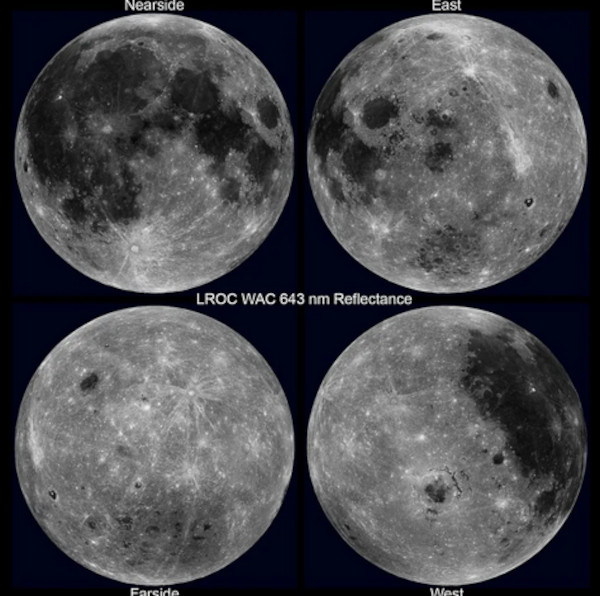Quatre vues hémisphériques de la Lune, obtenues à partir d’images prises par la sonde Lunar Reconnaissance Orbiter de la NASA. En haut à gauche : la face visible. En haut à droite : l’hémisphère est. En bas à gauche : la face cachée. En bas à droite : l’hémisphère ouest. (Source : NASA/GSFC/Arizona State University)