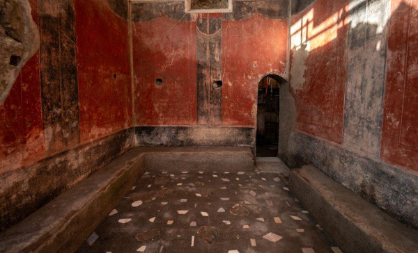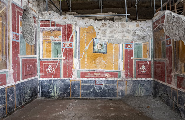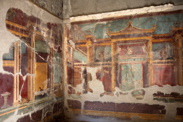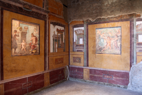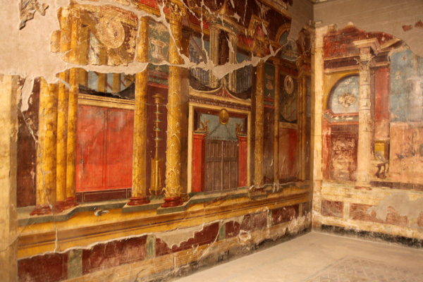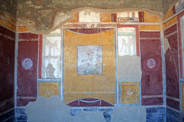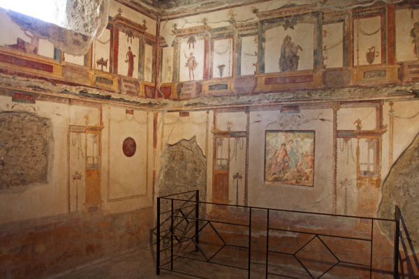 La Villa Arianna, ainsi appelée en raison de la peinture de sujets mythologiques trouvée sur le mur du fond du triclinium a été presque entièrement fouillée entre 1757 et 1762. Les décorations témoignent non seulement du haut niveau de vie qui devait y régner, mais aussi du goût extrêmement raffiné d’une clientèle de haut rang. Dans les grandes salles et les halls, les thèmes mythologiques sont principalement représentés par des figures presque grandeur nature inspirées de Dionysos, comme la peinture d’Ariane abandonnée par Thésée sur le mur du fond du triclinium, salle à manger, ainsi nommée en raison de l’utilisation de lits – kline – sur lesquels les invités s’allongeaient pour prendre leurs repas.