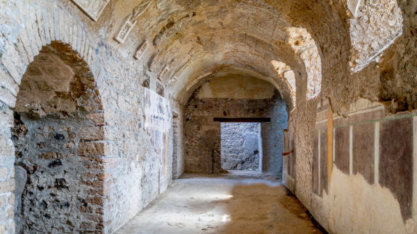 The House of the Golden Bracelet, a terraced structure decorated with colorful frescoes, was named for an adult found wearing the item and with a child astride on their hip. Next to them was another adult, presumed to be the child’s father. All three were found at the foot of a staircase that led out to a garden, while a second child was discovered a few meters away, possibly separated from the rest as they tried to escape to the garden.