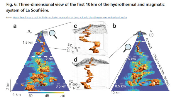 En analysant la façon dont toutes ces ondes se propageaient à l’intérieur du volcan les chercheurs ont pu reconstituer sa structure interne en 3 dimensions jusqu’à 10 kilomètres de profondeur et avec une précision de l’ordre d’une centaine de mètres. Au final, ils ont obtenu avec une résolution jamais atteinte, le plan de toute la tuyauterie de la Soufrière (voir image ci-dessous). On peut voir une cheminée légèrement tortueuse de 5 kilomètres de long et en dessous un réseau de poches de magma connectées entre elles. Les auteurs de l’étude n’hésitent pas à parler d’un outil révolutionnaire qui pourrait permettre à l’avenir de mieux prévoir les éruptions volcaniques.