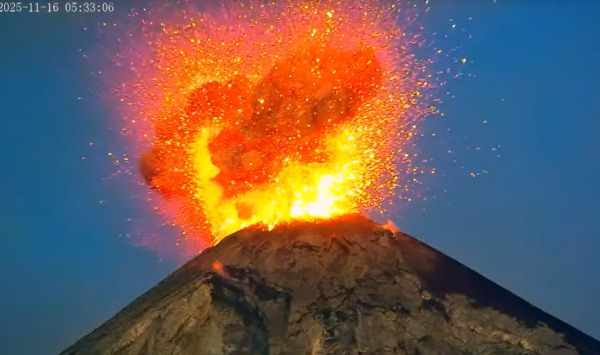 Une puissante activité strombolienne a été observée sur le Fuego (Guatemala) le 16 novembre 2025, avec des explosions, des projections incandescentes et un panache de cendres qui s’élevait à environ 4 300 m d’altitude avant de s’étirer sur environ 18,5 km depuis le sommet.