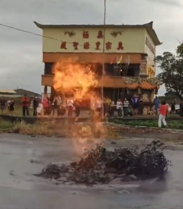 Un volcan de boue est entré en éruption devant le temple Huangyuan, dans le village de Wannei, canton de Wandan (Taïwan), le 12 novembre 2025. Cinq bouches ont craché de la boue et des gaz incandescents, avec des flammes atteignant environ 2 mètres de hauteur.