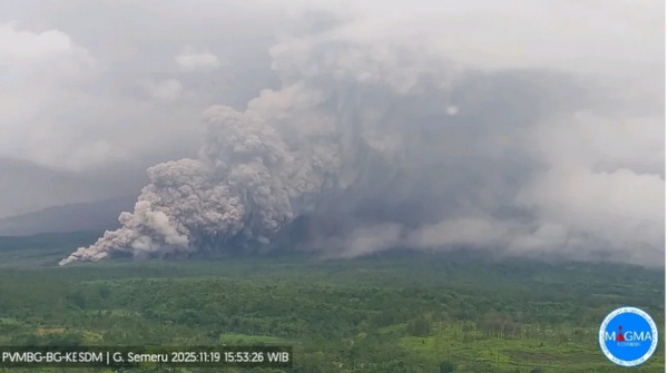 Une puissante éruption d’une durée d’environ 17 minutes s’est produite sur le Semeru (Indonésie) le 19 novembre 2025, générant une importante coulée pyroclastique et une colonne de cendres atteignant 16,5 km d’altitude.La couleur de l’alerte aérienne a été relevée au Rouge. Les autorités ont ordonné l’évacuation d’au moins 1000 habitants des villages voisins et ont étendu les zones d’exclusion jusqu’à 8 km du cratère et le long de la vallée de la Besuk Kobokan.  Elles ont également recommandé aux riverains d’éviter toute activité à moins de 500 m des berges de la rivière.
