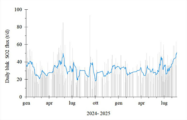 Still in the Aeolian Islands, the hourly frequency of explosions at Stromboli fluctuates around high values (15 to 19 events per hour). The intensity of the explosions is low to medium in the northern crater zone and low to high in the central-south zone.