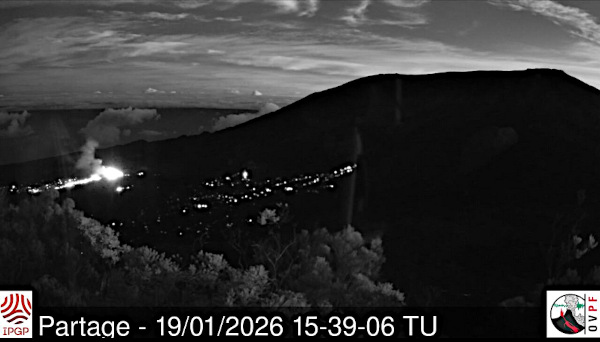 19 janvier 2026 – 6 heures (heure métropole) / 9 heures (heure locale) : Le jour s’est levé sur l’île de la Réunion et on distingue mieux les trois fissures qui se sont ouvertes le 18 janvier. L’éruption se poursuit, mais l’OVPF indique que l’activité est en baisse. Comme je l’expliquais précédemment, l’éruption a mis beaucoup de temps pour se déclencher (deux éruptions avortées en décembre et le 1er janvier) et il n’est pas certain qu’elle dure très longtemps. D’ici quelques jours, le 41ème épisode éruptif du Kilauea à Hawaï aura probablement une autre envergure…